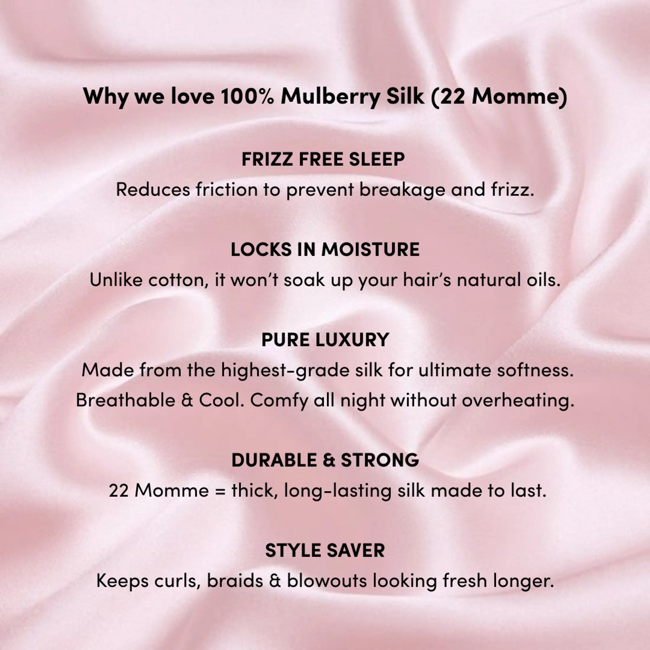 Recommended by dermatologists and hair experts alike, silk is the secret to reducing friction while you sleep – helping to prevent frizz, breakage, and creases. Our premium 22 momme silk is thicker, softer, and more durable than standard silk, giving you lasting luxury and visible results.