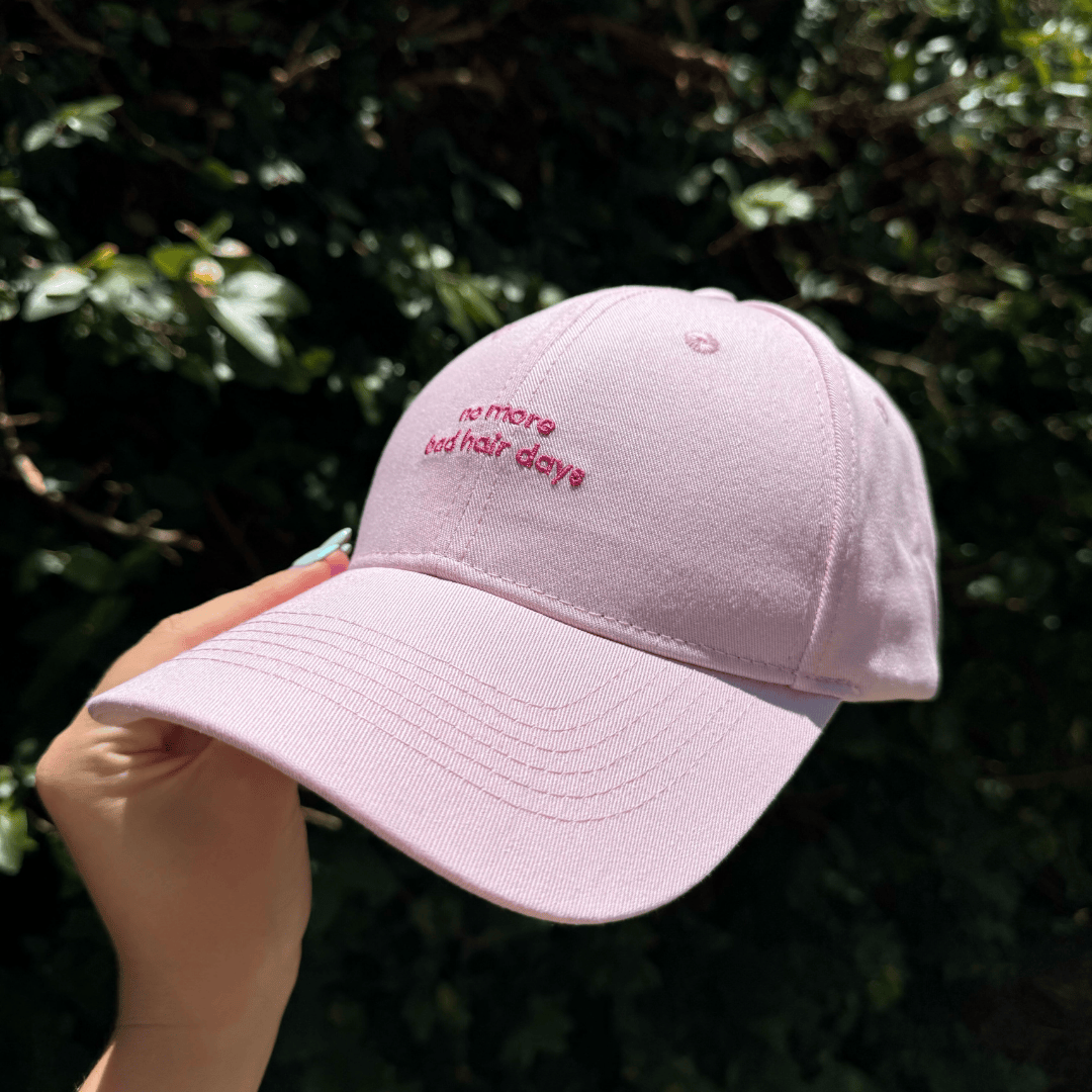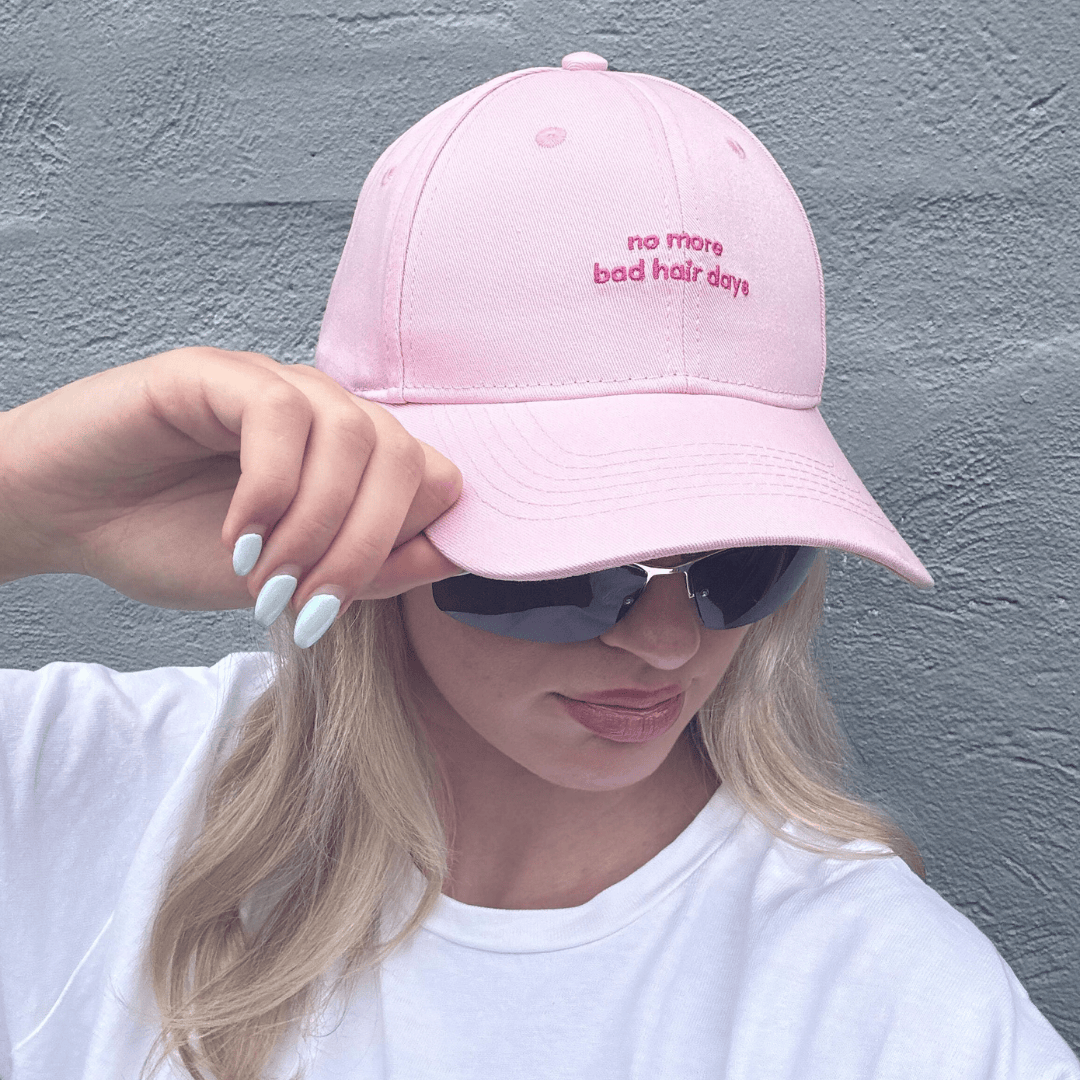 Top off your look with our pink cap that says it all: "No More Bad Hair Days." Fun, bold, and perfect for throwing on whenever you need a little extra attitude (or just to hide that bedhead).