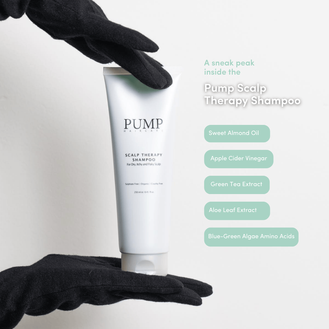 Pump Scalp Therapy Shampoo is formulated to balance a dry, itchy, flaky scalp and alleviate symptoms of dandruff. Apple Cider Vinegar to gently lift oils, Blue-Green Algae amino acids and Green Tea Extract to tone and balance the scalp.